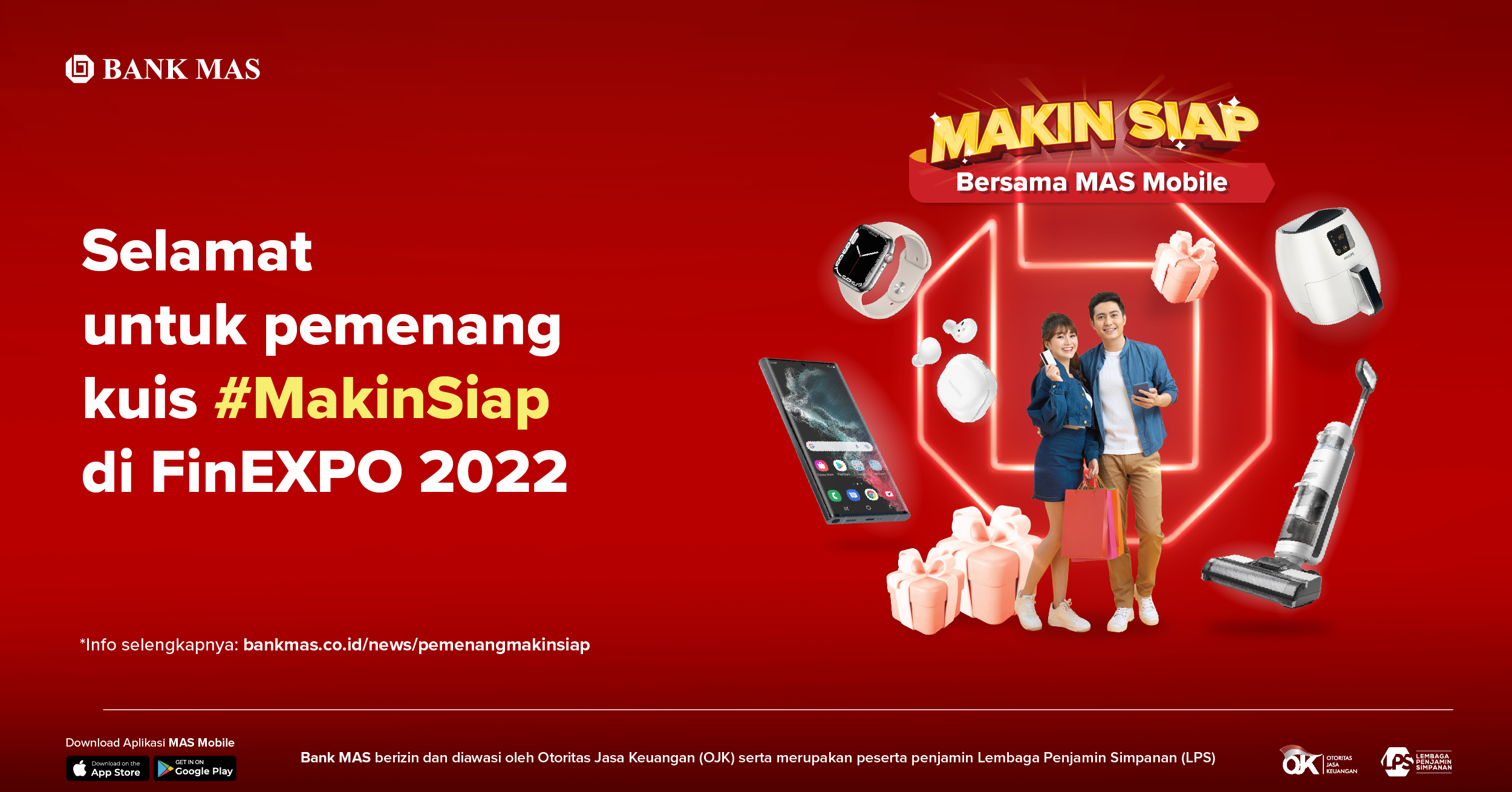 Terima kasih atas partisipasi kamu di kuis #MakinSiap yang berlangsung di booth Bank MAS dalam acara FinEXPO yang sudah berlangsung tanggal 26-30 Oktober 2022 lalu.